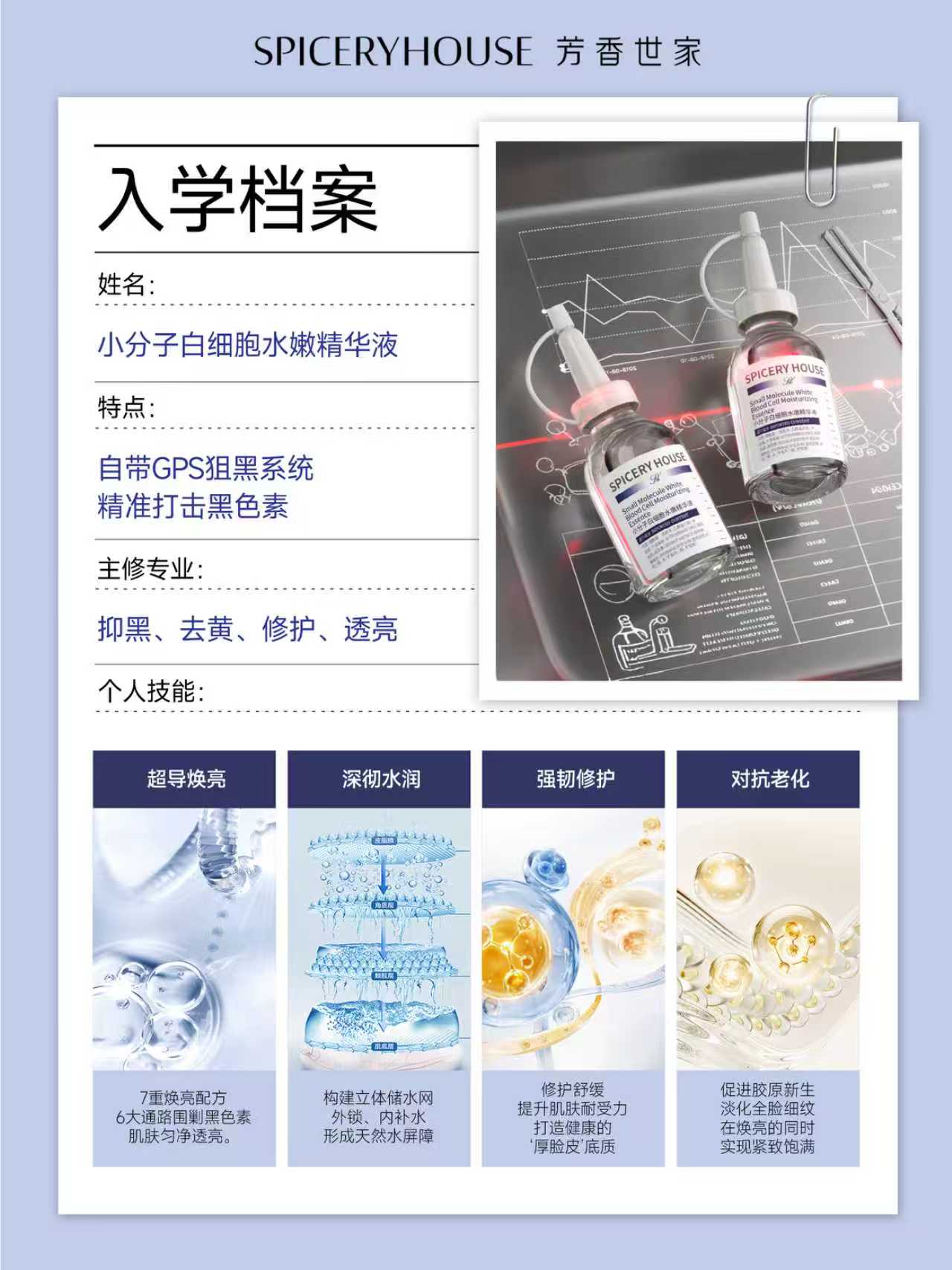 谁不曾为肤色暗沉、色斑横生而烦恼?紫外线照射、熬夜压力、屏障受损,都让黑色素细胞肆意“作乱”,传统美白产品要么只做表面功夫,要么成分单一难以渗透,终究难逃“美白无效”的尴尬。直到芳香世家SpiceryHouse小分子白细胞水嫩精华液的出现,以创新“肌因光感GPS”狙黑系统打破瓶颈,像精准导航般锁定每一处黑色素,从根源完成“定位-渗透-瓦解-修护”全链路打击,让肌肤重现原生透亮水光感。作为创立于2012年的国妆实力品牌,芳香世家始终秉持“简”与“和”的核心护肤理念,摒弃成分堆砌的浮躁,专注以科学配方直击肌肤核心问题。这款小分子白细胞水嫩精华液,正是品牌十余年科研沉淀的匠心之作,将小分子渗透科技与多维植萃精华完美融合,实现“精准狙黑+深层养肤”的双重突破,重新定义科学美白的底层逻辑。“GPS狙黑系统”的核心奥秘,在于构建了一套无死角的狙黑网络,而小分子渗透技术便是这套系统的“导航通道”。传统美白之所以效果甚微,根源在于有效成分分子量大,难以穿透角质层,只能停留在表层做“表面功夫”。而这款精华液搭载的小分子渗透技术,能将核心养肤成分拆解为纳米级小分子,轻松穿透肌肤三道防护屏障,直达肌底细胞间隙,渗透速度是普通精华液的3倍。我们可以通过一个简单实验直观验证:将同等量的精华液与纯净水分别浸泡茶叶,小分子精华液能让茶叶在短时间内快速舒展,充分释放茶多酚,这也印证了其强大的渗透能力——只有成分精准抵达黑色素根源,才能实现真正的“靶向狙黑”。如果说小分子技术是“导航仪”,那15维全能养肤配方就是GPS狙黑系统的“核心弹药”。芳香世家基于皮肤科学原理,精选多重活性成分,形成涵盖“抑黑、修护、补水、抗氧”的全方位养肤体系,让狙黑过程更温和、养肤更全面。其中,核心的5%射干提取物搭配12味植物凝萃,协同9种矿物质与9种维他命,像“肌底营养师”般为肌肤补充能量,从根源提升肌底活力;21种氨基酸、5种核酸及6种辅酶则为细胞注入修护动力,改善因黑色素沉积导致的肌肤粗糙、细纹问题。更值得一提的是,配方中特别添加的茶叶提取物(高活性茶多酚)与类积雪草修护成分,构成了“抑黑+屏障修护”的黄金组合。茶多酚作为强效抗氧化剂,能精准清除自由基,从源头抑制黑色素生成,相当于在黑色素生成的“起点”设下关卡;类积雪草则能强韧肌肤屏障,提升肌肤锁水能力,避免美白过程中出现的干燥、泛红等不适,让敏感肌也能安心开启狙黑之旅。这套配方完美契合芳香世家“成分协同增效”的研发理念,拒绝单一成分的“猛药式”护肤,让每一滴精华都能发挥最大价值。真正的好产品,既要功效出众,更要适配全肤质、肤感舒适。这款精华液质地清爽轻盈,流动性极佳,上脸后轻轻拍打便能快速吸收,无黏腻残留,后续叠加护肤或上妆都不会搓泥——这正是其备受青睐的关键之一,无需恢复期,日常护肤即可轻松融入。干性肌肤使用后能快速缓解干燥紧绷,让肌肤变得柔软弹润;油性肌肤用后清爽不闷痘,还能调节水油平衡,告别“油光满面”;即便是脆弱敏感肌,也能在其温和配方的滋养下,实现“边狙黑边修护”的理想效果。