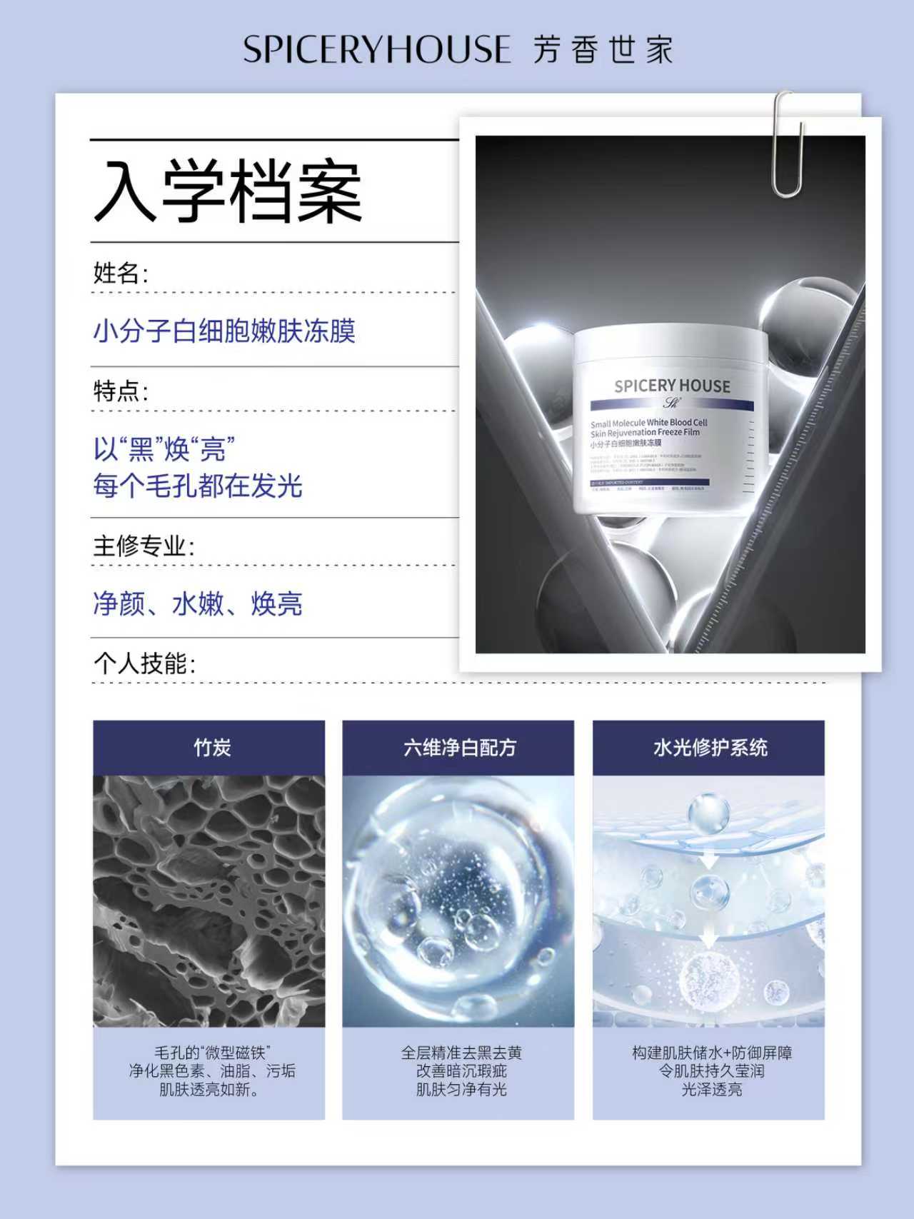 谁不向往毛孔干净通透、自带高光的原生好肌?可现实里,熬夜后的蜡黄倦容、毛孔内堆积的污垢暗沉、紫外线催生的黑色素,让肌肤始终透着“灰蒙蒙”的质感。试过不少美白产品,要么是只改表层肤色的“假白”,洗后立刻打回原形;要么是清洁力过强的猛药配方,用完肌肤泛红紧绷。直到芳香世家SpiceryHouse小分子白细胞嫩肤冻膜登场,以独创的“以黑焕亮”护肤逻辑,打破传统焕亮的局限,从毛孔到肌底实现深层净化与焕亮,让每一个毛孔都能透出健康光泽。自2012年创立以来,芳香世家始终坚守“简”与“和”的核心护肤理念,摒弃冗余刺激成分与盲目堆砌,专注以科学配方直击肌肤核心痛点。这款小分子白细胞嫩肤冻膜,正是品牌十余年科研积淀的匠心之作,将专利小分子渗透技术与“黑色养肤矩阵”深度融合,实现“深层清洁、肌底焕亮、屏障修护”三重突破,重新定义冻膜类产品的养肤底层逻辑。