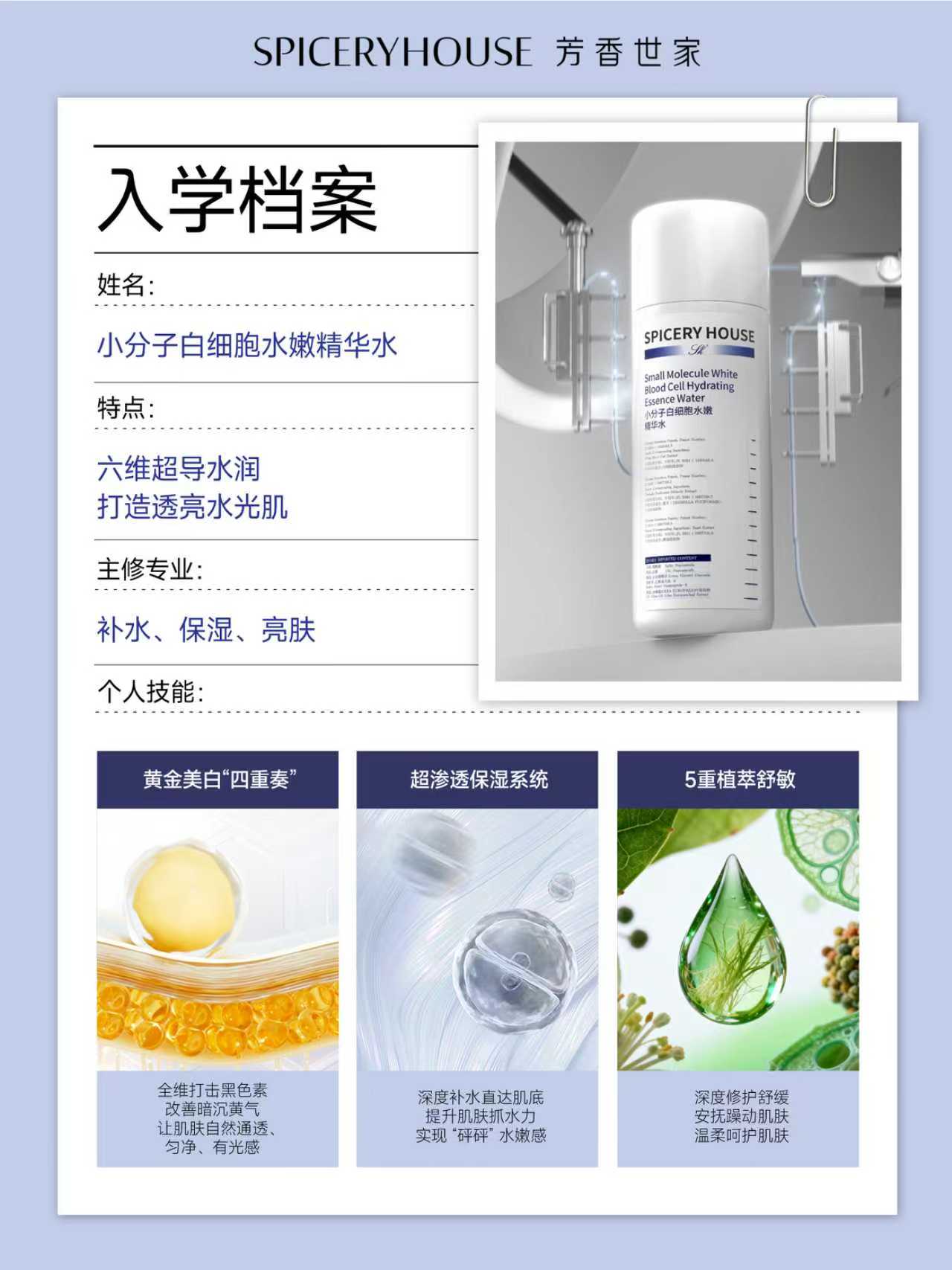 第一维是300倍超微分子玻尿酸,作为“肌底水库构建者”,它能穿透肌肤深层,在真皮层形成稳定的储水网络,为肌肤补充充足水分;第二维是智能水光因子组,包含温泉水、水解大豆蛋白等成分,温泉水富含矿物元素强韧屏障,水解蛋白则激活肌肤“造水”本能,让肌肤自主锁水能力翻倍;第三维是5重天然植萃修护矩阵,专利燕麦β-葡聚糖深层修护、洋甘菊提取物舒缓祛红、甘草提取物提亮祛黄、类积雪草提取物强韧屏障、茶叶提取物抗氧化,从多维度修复受损肌肤,为水润打下坚实基础。第四维是小分子白细胞提取物,作为核心修护成分,它能精准修复肌底损伤,提升肌肤免疫力,让补水与修护同步进行,避免“越补越敏感”的尴尬;第五维是Sodium PCA,作为皮肤自带的原生保湿因子,它能调节肌肤生理机能,提升角质层含水量,让水分更持久锁留;第六维是尿囊素,进一步强化屏障完整性,在舒缓抗敏的同时提升皮肤光滑度,让肌肤触感更柔嫩。这六维成分如同“肌肤营养师天团”,从渗透到修护、从补水到焕亮,全方位覆盖肌肤需求。除了硬核的配方与技术,这款精华水的肤感与适配性也堪称惊艳。它采用清透的水状质地,触肤即化,吸收后肌肤清爽不黏腻,完全没有厚重感。无论是干燥肌用作日常补水打底,还是油性肌、混合肌调节水油平衡,都能完美适配;熬夜党用它急救,能快速缓解肌肤干黄倦容;敏感肌在其温和配方的滋养下,也能逐步改善干燥泛红,恢复稳定状态。更值得一提的是,它还可搭配定制美容仪使用,搭配射频仪能让渗透提速200%,搭配导入仪则让营养吸收率飙升150%,轻松拉满水光续航力。产品坚持“无人工香精、无酒精、无有害防腐剂、无荧光剂”的四无添加原则,经过多重肌肤敏感测试,就连孕期、哺乳期女性也能在专业指导下安心使用。无数用户的真实反馈印证了它的实力:坚持使用14天,就能明显感受到肌肤干燥感缓解,摸起来细腻弹润;使用28天后,肌肤由内而外透出透亮光泽,上妆再也不会卡粉,素颜状态下也能拥有好气色。有用户评价:“这才是真正的‘肌底喝水’,用完皮肤像剥了壳的鸡蛋,又嫩又亮。”从品牌初心来看,芳香世家始终坚守“做一个让爱我的人和我爱的人一生放心使用的护肤品”的单纯梦想,以“对研发不惜成本,对技术精益求精”的态度深耕国妆领域。这款小分子白细胞水嫩精华水,正是这份初心的最佳载体——它不仅是一款高效的补水精华水,更传递出“女人天生骄傲,国妆自带荣耀”的品牌态度。告别表面补水的徒劳,无需再依赖厚重底妆掩盖干燥暗沉。选择芳香世家SpiceryHouse小分子白细胞水嫩精华水,让“六维超导水润”体系为你重塑水嫩肌底,在温和奢护中养出匀净、通透、弹润的原生水光肌,从此每一寸肌肤都透着健康光泽,自信绽放自然美感。
