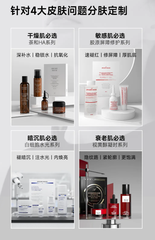 千人千肤,护肤从来没有万能公式。盲目跟风种草、照搬他人护肤方案,只会让肌肤问题愈发严重:敏感肌越护越泛红、油痘肌越控越长痘、干皮越补越紧绷、暗沉肌越养越无光。想要摆脱肌肤困境,核心在于精准把脉肌肤痛点,针对性分肤定制护理方案,拒绝无效护肤,让每一份养分都用在刀刃上。芳香世家Spiceryhouse深耕护肤领域多年,深谙不同肤质的修护需求,聚焦当下人群最困扰的