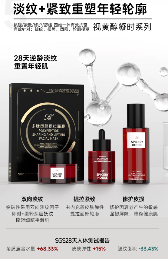 岁月从不留情,肌肤的衰老痕迹总是悄然而至:25岁后胶原加速流失,干纹悄悄爬上眼周嘴角;熬夜、紫外线侵袭,细纹加深变皱纹,肌肤松垮下垂、轮廓模糊;肤质日渐粗糙干瘪,失去弹性与光泽,整个人都透着疲惫老态。想要对抗时光痕迹,无需依赖医美,选对科学抗衰单品,就能轻松逆转肌龄,找回紧致嘭弹的年轻状态。芳香世家Spiceryhouse视黄醇凝时系列,专为初老、熟龄肌量身打造,深耕抗衰护肤科研,摒弃刺激性强的低效抗衰配方,以高活性温和视黄醇为核心,搭配多重抗老精粹,精准直击细纹、松垮、暗沉、干瘪四大衰老痛点,遵循肌肤28天新陈代谢周期,层层淡纹、紧致提拉、焕活胶原,实现逆龄焕变,28天重置饱满紧致、细腻弹嫩的年轻肌态,定格时光之美。