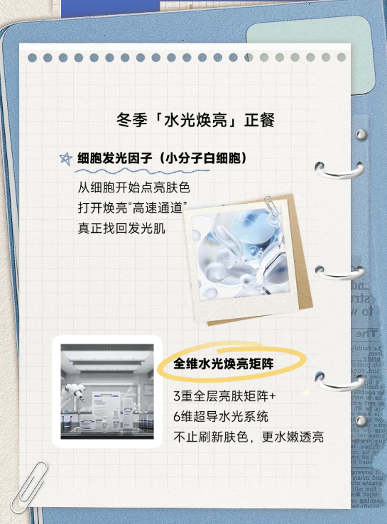 • 小分子白细胞水光面霜:作为焕亮正餐的“收尾甜品”,质地温润绵密,滋润不厚重,上脸不黏腻、不闷痘。既能牢牢锁住肌肤水分与营养,长效抵御冬季干燥寒风,减少水分流失,又能持续焕亮肤色,改善肤色不均,让肌肤整日保持水润莹亮,筑牢冬日肌肤防护锁水屏障。