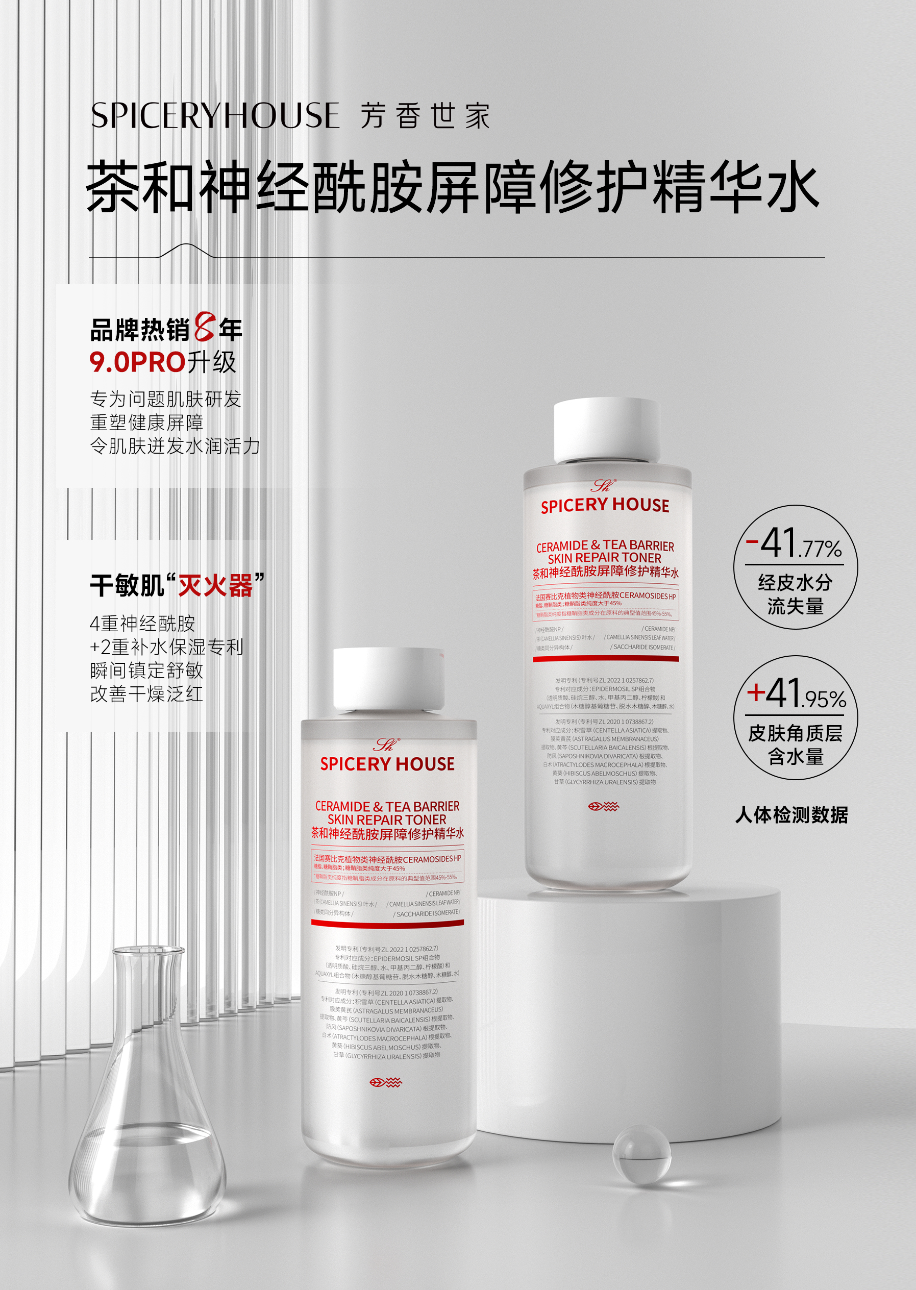 换季泛红发烫、干燥紧绷刺痛、遇冷遇热就“闹脾气”、护肤品上脸就刺痛脱皮……对于干敏肌来说,肌肤屏障受损就像时刻处于“着火”状态,稍不留意就泛红干痒,普通爽肤水只补水不修护,根本压不住肌肤的“火气”。想要快速灭火、筑牢屏障,芳香世家SPICERYHOUSE茶和神经酰胺屏障修护精华水,就是专为干敏肌定制的专属“灭火神器”,兼顾即时舒缓急救与根源屏障修护,让脆弱干敏肌告别反复敏感,重拾水润稳韧状态。干敏肌“着火”根源:屏障失守,缺水又缺护
